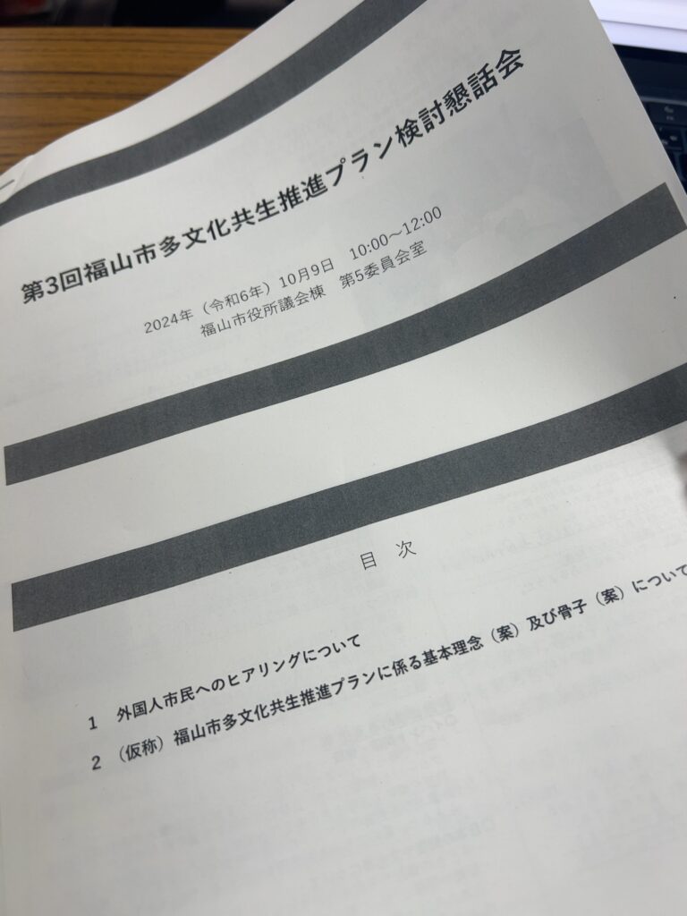 本日10月9日(水)10:00より福山市役所にて開催された、「第3回福山市多文化共生推進プラン検討懇話会」へ参加させていただきました。