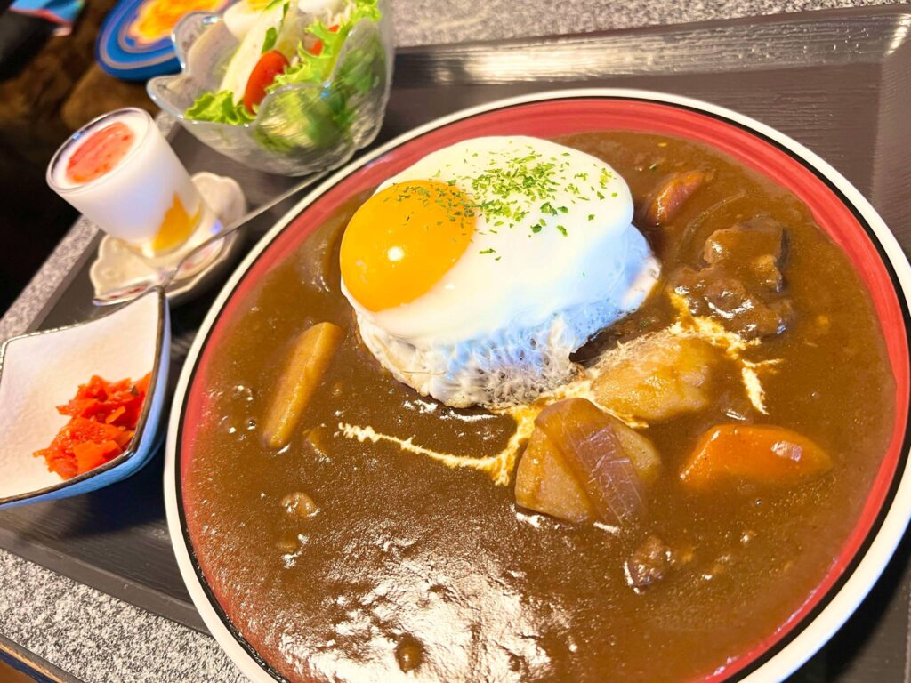 追加した目玉焼きトッピング(+200円)も少し辛めのルーとの相性が抜群。