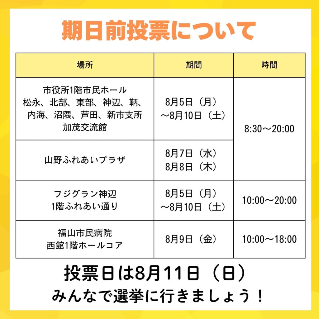 8月5日(月)より、福山市内各所にて福山市長選挙の期日前投票が始まっています。