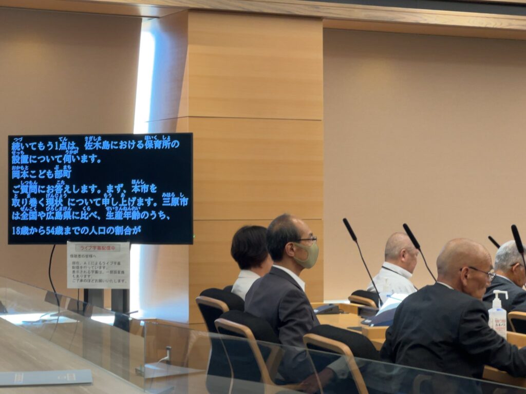 議場左手に大型ディスプレーが配置されており、リアルタイムで発言内容が文字起こしされて表示されています。