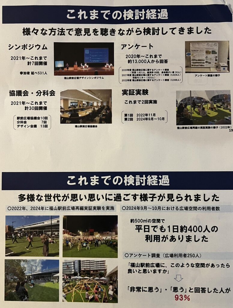 【福山市民の中において、福山駅南側の「全面広場化」に対して反対の声が多く、かつ「現状維持」または「少し拡大した程度の広場」を臨む声が多いことを、行政の皆様がもし今日まで知らなかった】とするならば、これまで4年以上費やしてきた期間、費用、様々な協議や実験、取り組みはなんだったのか。