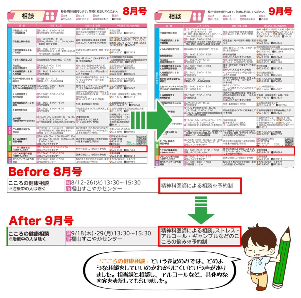 この課題を担当課に伝え、表記の要望をさせていただいたところ、2025年9月号からは【ストレス・アルコール・ギャンブルなどのこころの悩み】と具体的に表記されることになりました。