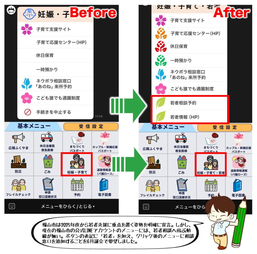 ② 福山市の公式LINEに「若者相談」導線を追加要望