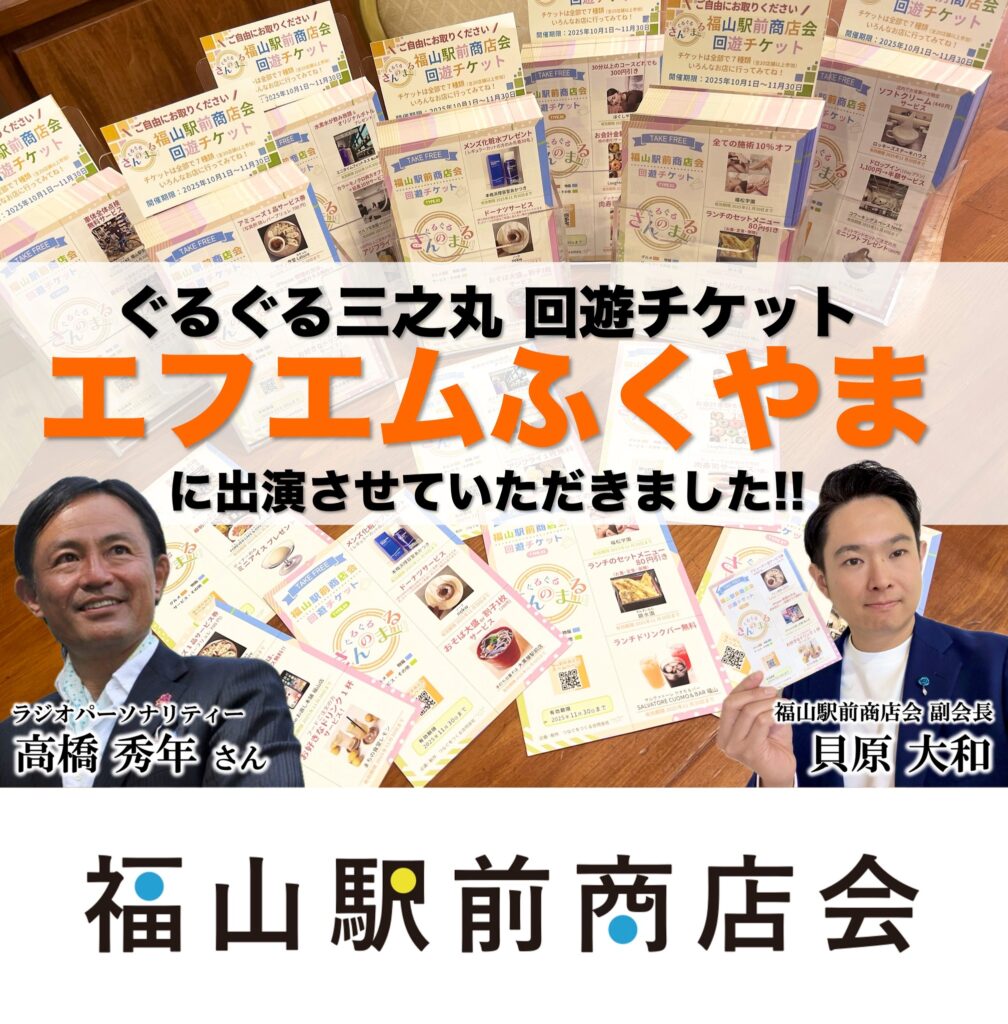 エフエムふくやまさんにて、2025年10月1日より開始している福山駅前商店会の新企画「ぐるぐる三之丸 回遊チケット」についてご紹介させていただきました!