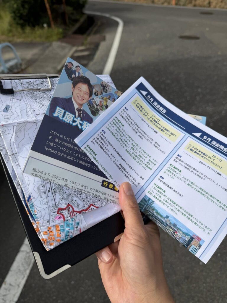 現職議員として回らせていただくこの度は「こんにちは。福山市議会議員の貝原大和と申しまして、議会のたよりをお配りさせてもらっています。よかったら、時間がある時にでも読んでください。」というセリフに変わりました。