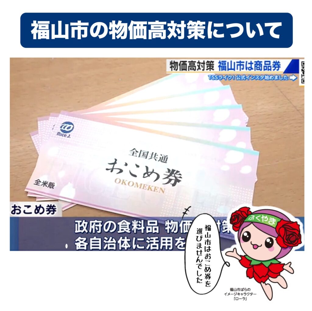 政府が進める物価高対策「重点支援地方交付金」では、自治体に対し「おこめ券(1人3,000円相当)」の配布が推奨されていましたが、福山市はおこめ券は採用せず、より使い勝手の良い「商品券」を配布する方針を示し、福山市議会で可決されました。