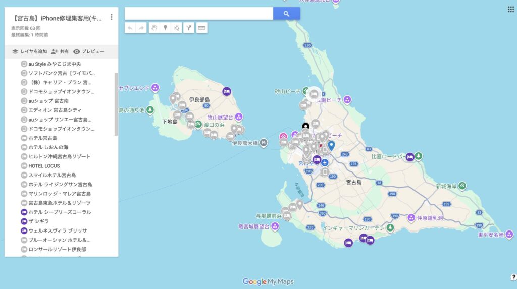 2枚目の写真は、宮古島・伊良部島内のキャリアショップ、電気屋さん、ホテル53箇所への挨拶回りの記録で、グレーにしている箇所が実際に伺った施設。