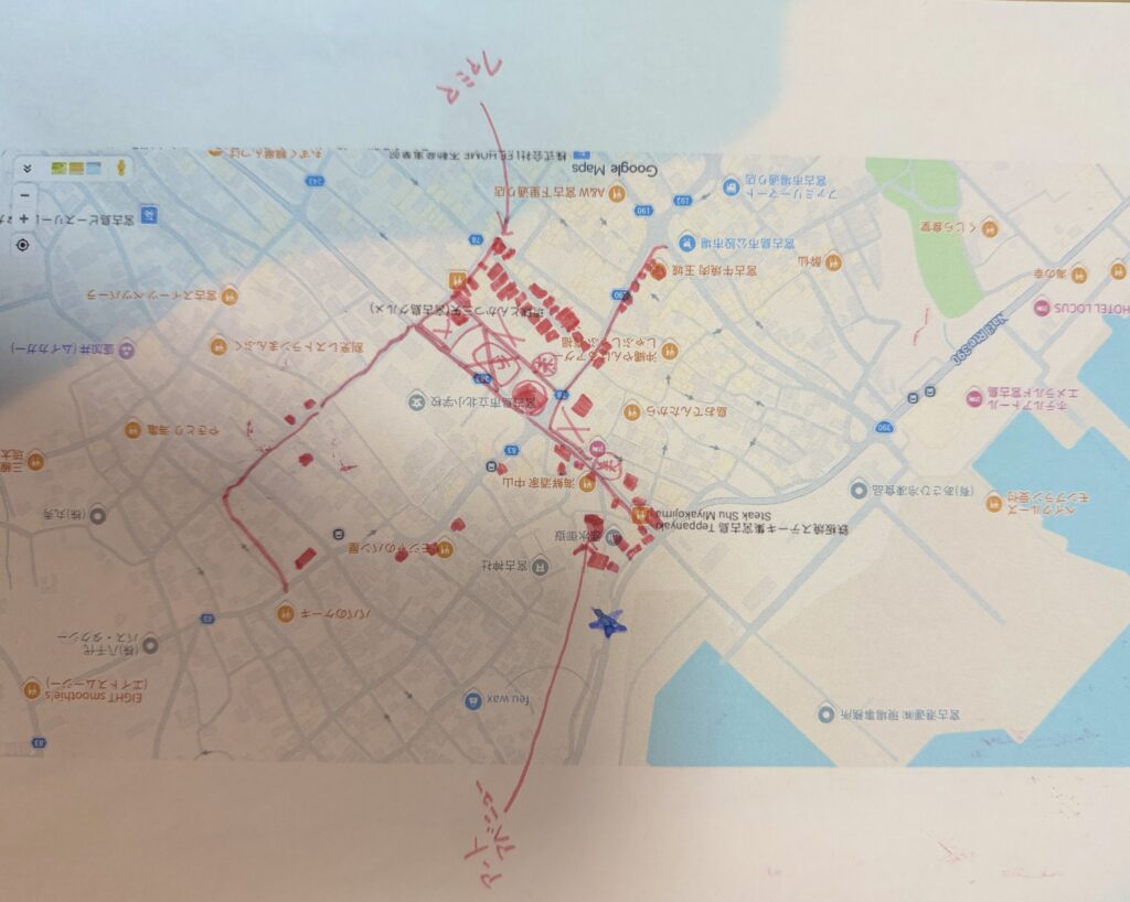 3枚目の写真は中心地での挨拶回りの記録で、記録できていないお店も含めると60店舗以上を回りました。