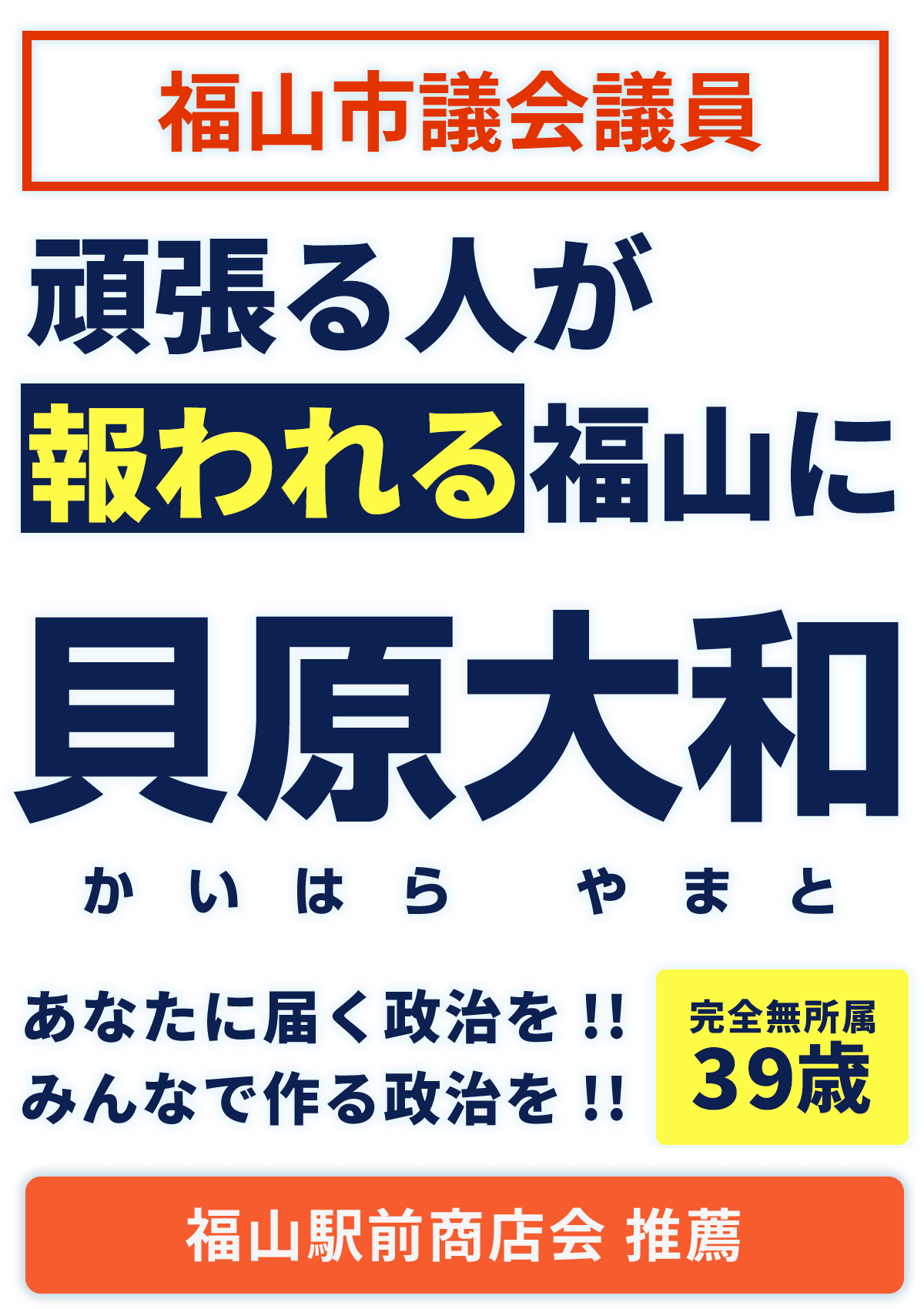 大和くんは東京で活動している頃からの仲ですが行動力の塊のような人間です。印象的だったのは彼の昔の投稿でライバルとなる相手に負けてもしっかりとリスペクトをして相手を称えるところでした。中々自分を見つめて相手を讃えることって簡単じゃないと思うんです。相手にしっかり寄り添うことができる彼は福山市政の大きな力になります!!頑張ってください!