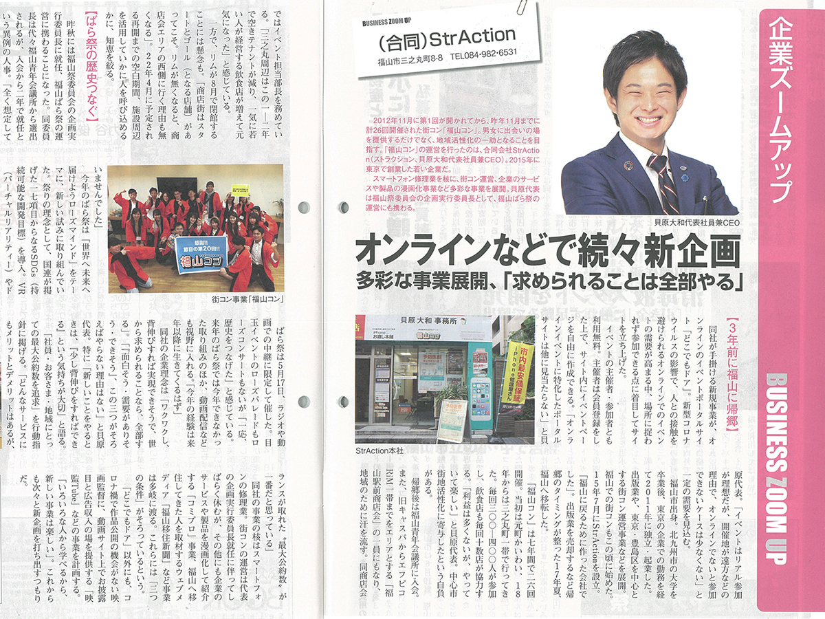 街コン、被災地支援、リアル謎解きゲーム、スポーツ観戦イベント、書籍の出版、スマートフォン修理、漫画プロモーション、セルフ写真館、福山駅前商店会、その他活動等、これまでの活動を多くの方に応援していただき、そして注目していただくことができました。この感謝の気持ちを「より活動の量と質を増やしていくこと」によって、少しずつ恩返ししていきたいと思います。