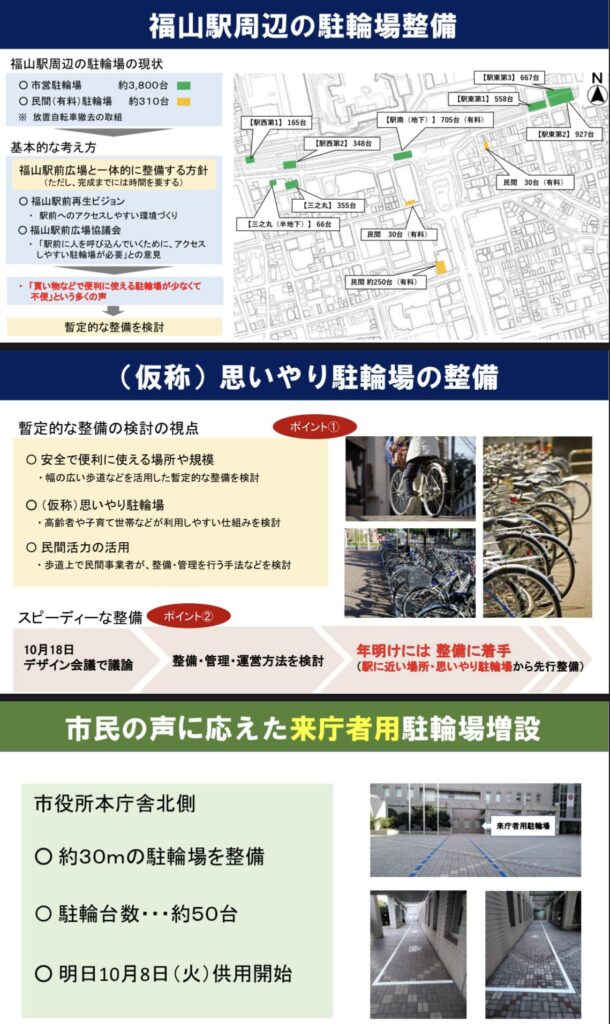 その中で10月の定例市長記者会見の中で発表された、「(仮称)思いやり駐輪場」についての質疑をさせていただき、高齢者や子育て世代を対象に、福山駅南北合計20台を停めるとこができる駐輪場を建設予定であることや、建設費700万円+防犯カメラや電気代、人件費などのランニングコスト(金額未定)をかけることが示されました。