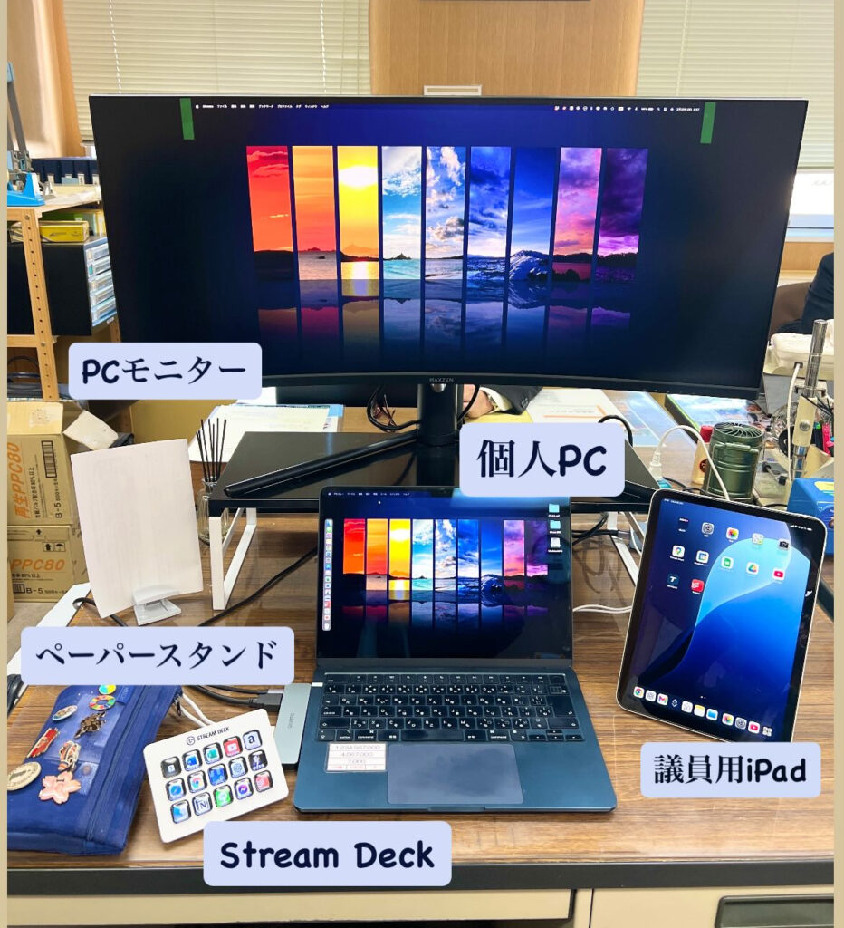 同僚議員や事務局員の皆さんからは「モニターすごいですね!」「これは一体何ですか?」と驚かれることも多く、インパクトを与えることに成功しています(笑)