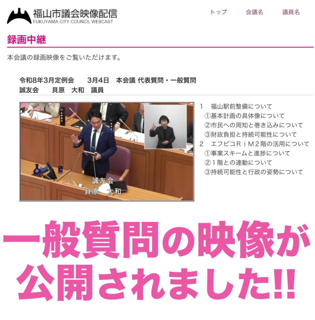 3月4日(水)に登壇した、福山市議会2026年3月定例会での一般質問の録画映像が公開されました。