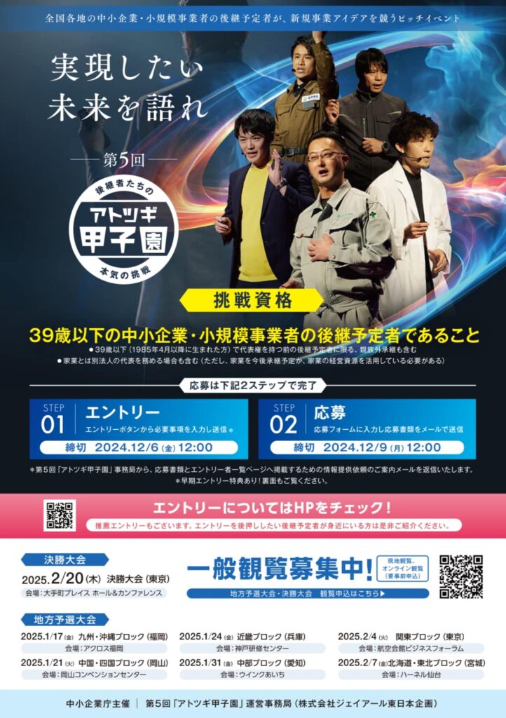 この大会は、39歳以下の中小企業・小規模事業者の後継者を対象としたもので、応募条件として「社内リソースを活かしたチャレンジ」や「自身のストーリー性」が求められます。