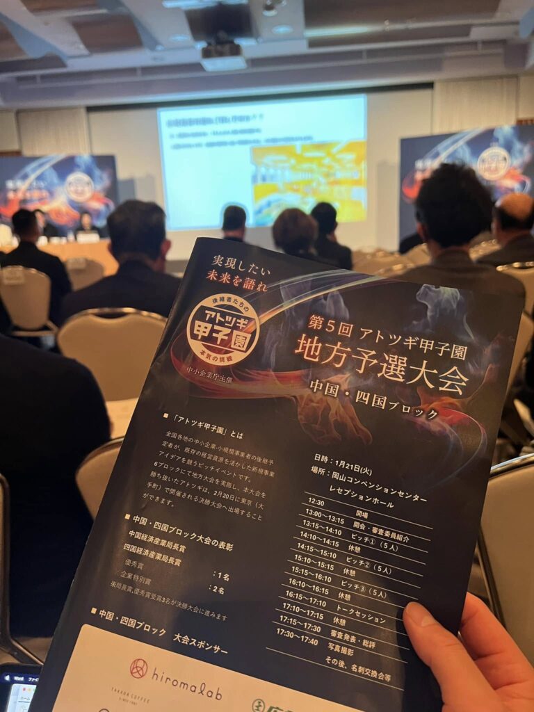昨日1月21日(火)は、広島青年会議所の昨年の理事長である森信さんからお誘いをいただき、岡山市で開催された「アトツギ甲子園」予選の中四国大会を観覧してまいりました。