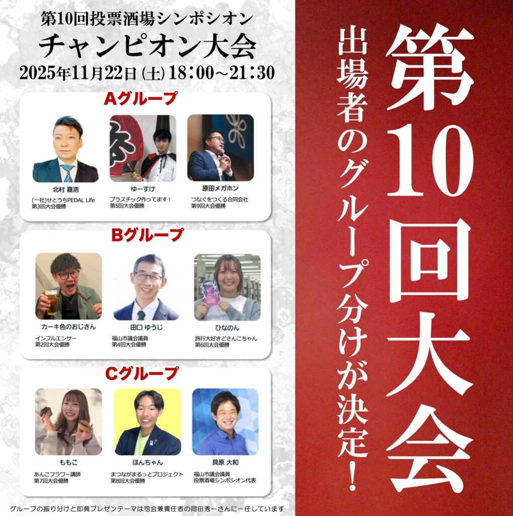 今回のチャンピオン大会は、司会と全体の責任者を岡田秀一さんにお願いし、お題の設定から出場者のグループ分けまで、運営面を一任しています。